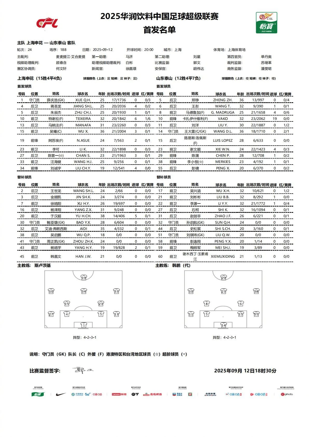 虎扑09月12日讯 中超第24轮,上海申花vs山东泰山将于20:00开战,赛前双方公布了首发名单。